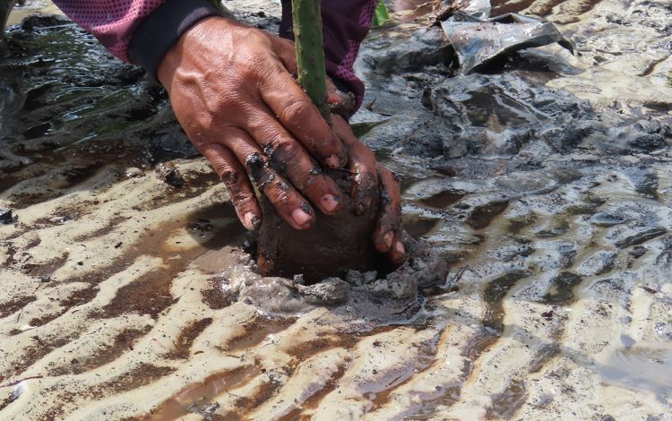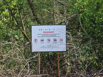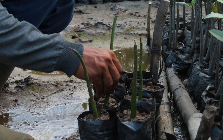 Mangrove seedling planting is only carried out in areas where natural regeneration is not yet possible, such as on beaches vulnerable to large waves. Planting interventions include the use of wooden fences with nets to reduce wave impact. This method can increase seedling survival rates from 0% to over 50%.