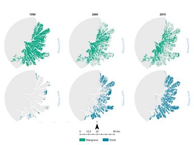 This shows a variety of conclusions, including that this period might be the saturation point of aquaculture land conversion. It could be something to do with the land availability, regulation, or pressure on the significant rate of change. It will be interesting to see is there any relation between the mangrove degradation and pond increasing?