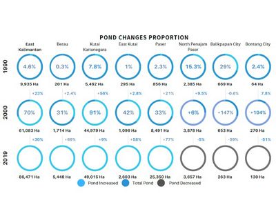 In other way, noticeable change of pond occurs between 1990-2000 which considered being the peak period of conversion. It is estimated that 61,083 ha or roughly 70% of the total ponds in 2019 as identified 86,471 hectares in East Kalimantan Province. In general, the addition of ponds area continued to occur in the period of 2000-2019 but the intensity was drastically reduced. There are at least 3 regions that matched with the results of the in-depth interview process which shows that the Mahakam Delta with an area of 5,462 Ha, North Penajam Paser Regency with an area of 2,385 Ha, and Paser Regency with an area of 852 Ha as the pioneering area aquaculture ponds in East Kalimantan in the 1990 period.