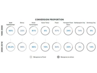 East Kalimantan Province has the third largest mangrove in Indonesia, behind Papua and Riau Province. Mangroves in East Kalimantan experienced great pressure from land conversion into ponds. The history of the East Kalimantan mangrove conversion began around 1970-2000 with a peak in 1980-1990 affecting the coastal regions of the Mahakam Delta, North Penajam Paser, and Paser. The initial cause of these changes is the existence of migrant movements. The results of the in-depth interview showed that the migration process was the pioneer of new communities and eventually transformed it into a core village, for instance, the villages of Muara Pantuan and Sepatin in Kutai Kartanegara Regency. This transformation process also started the conversion of mangrove forest into pond using a traditional tool called Kong. The conversion of the function of the mangrove forest also occurred due to illegal logging which became a massive economic activity specifically in the Mahakam Delta and Balikpapan Bay until it finally stopped in 1970 with the beginning of the Orde Baru period which agreed to oblige a forest concession.