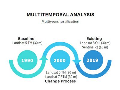 Yayasan Konservasi Alam Nusantara, through Indonesia Oceans Program, developed the mangrove and pond spatial multi-temporal analysis in East Kalimantan using satellite imagery such as Landsat 5 TM which retrieved data in 1990, Landsat 7 ETM+ which use for retrieving data in 2000 and Sentinel 2 which retrieving data in 2019. Based on the history of mangroves in East Kalimantan, 1990 was identified as the beginning of mangrove deforestation in East Kalimantan, thus making it baseline data in this study shown in Figure 1. Furthermore, 1990-2000 was recorded as the peak deforestation process in East Kalimantan, making it the changing process data used as the identifier. We also put the existing condition through a 2019 analysis that uses Sentinel 2 which has a larger spatial resolution (10 m) than Landsat 5 & 7 (30 m).